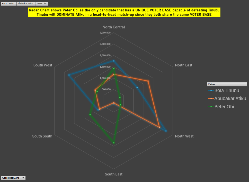 Nigeria’s 2023 presidential election didn’t just produce a winner; it revealed three distinct electoral coalitions with very different “geographies of strength.” When you aggregate the results by geopolitical zone (as visualized in the attached radar chart), a clear strategic conclusion emerges: